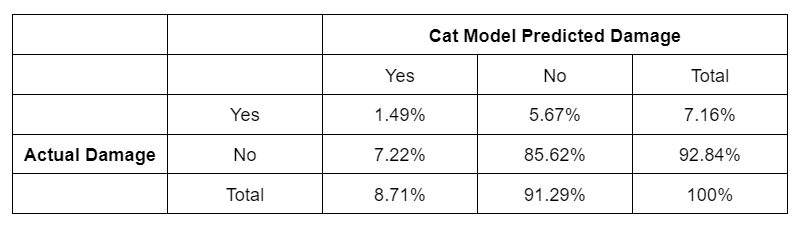But of the specific houses that were damaged by the storm, only 20.8% were correctly predicted by the model while 79.2% were erroneously given the all clear. Of the houses that were spared, 92.2% were correctly classified by the model. However, when the cat model predicted that damage would occur, 82.9% of the time it was found to be a false alarm.