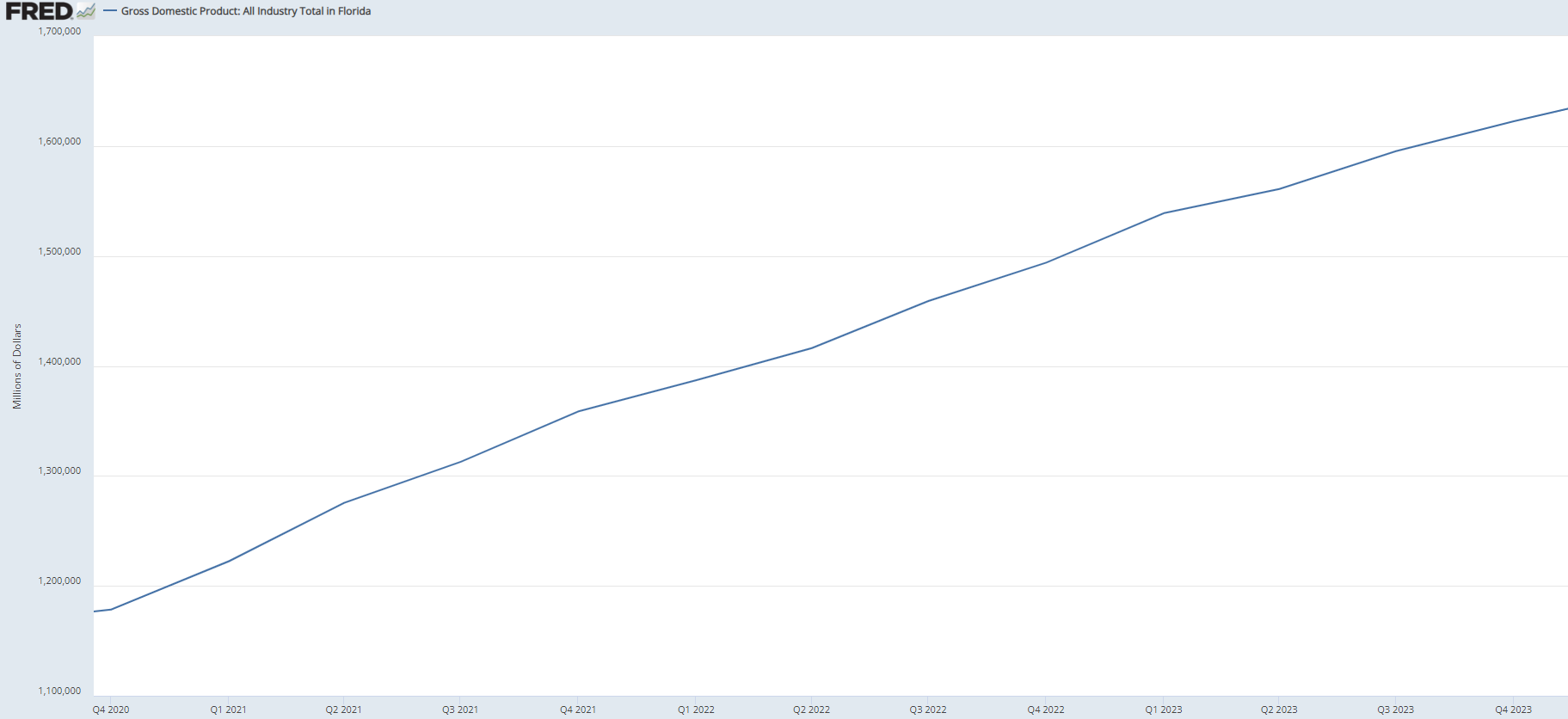 Now of course lurking beneath the smooth GDP growth trendline are tens of thousands of low-income Floridians who are still struggling to make ends meet, earning less – and spending less – than they did before Ian. But aggregate spending is what matters here. When the biggest spenders of all open their wallets in the wake of a disaster – in this case, the federal government – aggregate spending is likely to rise. In the case of Hurricane Ian, Florida was the put buyer, and the US taxpayer the put writer.